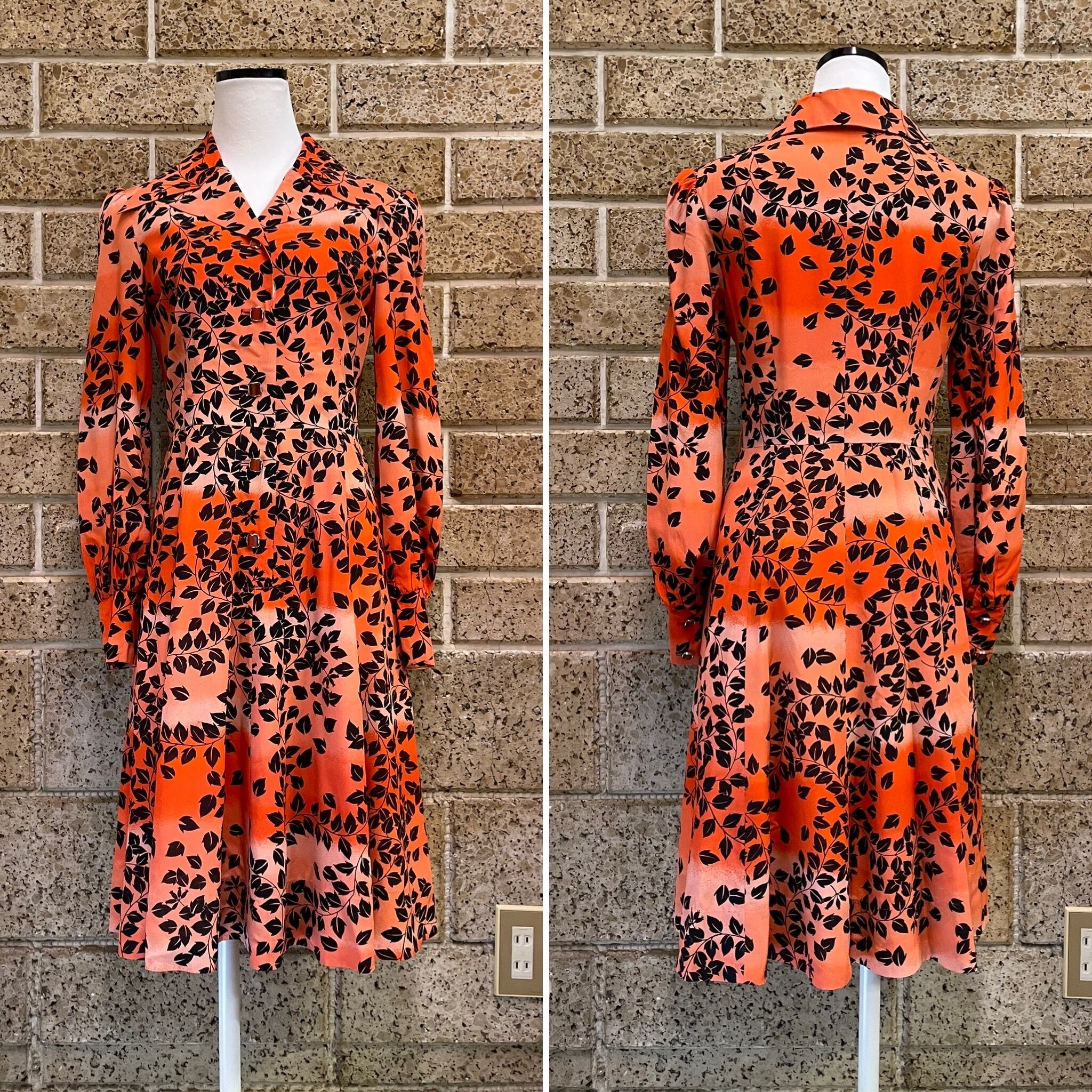 オレンジのグラデーションに黒の葉っぱがシルエットに見え、夕焼けの空を生地にした様なプリント