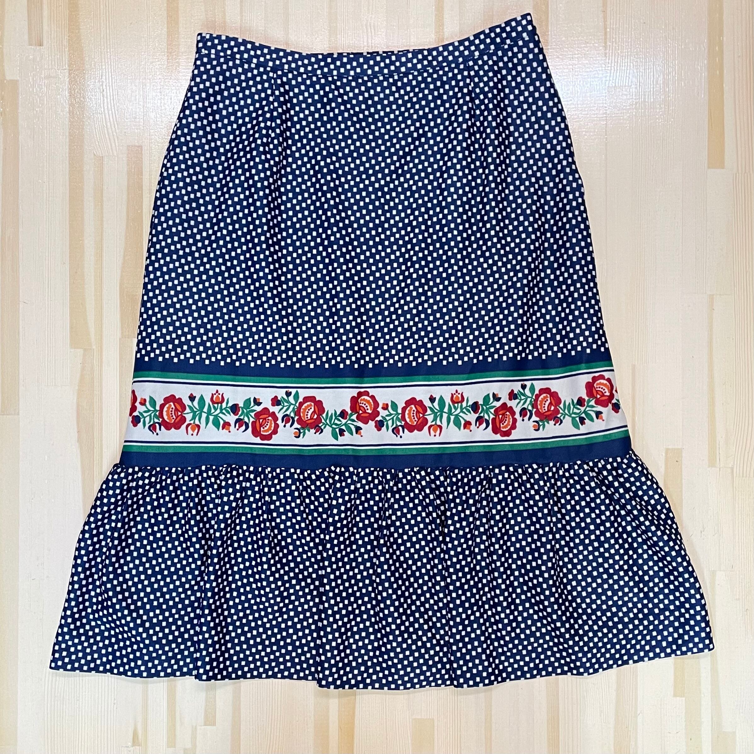 ネイビーの四角柄にチロリアンテープの様に一筋の花柄♡そこからティアード切り替えになっています。